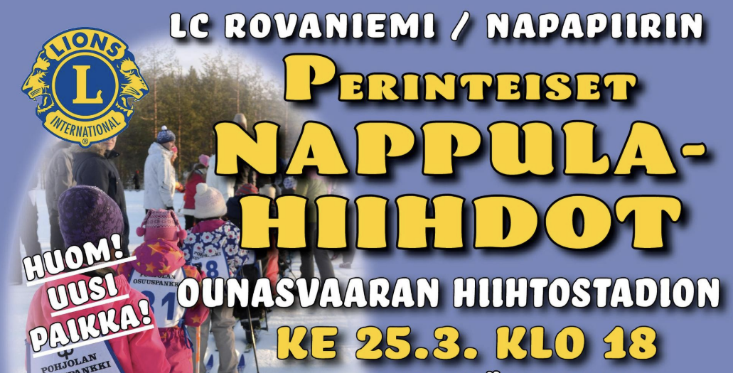TULOSSA! LC Rovaniemi/Napapiirin Perinteiset Nappulahiihdot Ounasvaaran hiihtostadionilla ke 25.3.2026 klo 18. Sarjat tytöt ja pojat alle 10 v. Kaikki palkitaan! ILMOITTAUTUMISET ja LISÄTIEDOT…