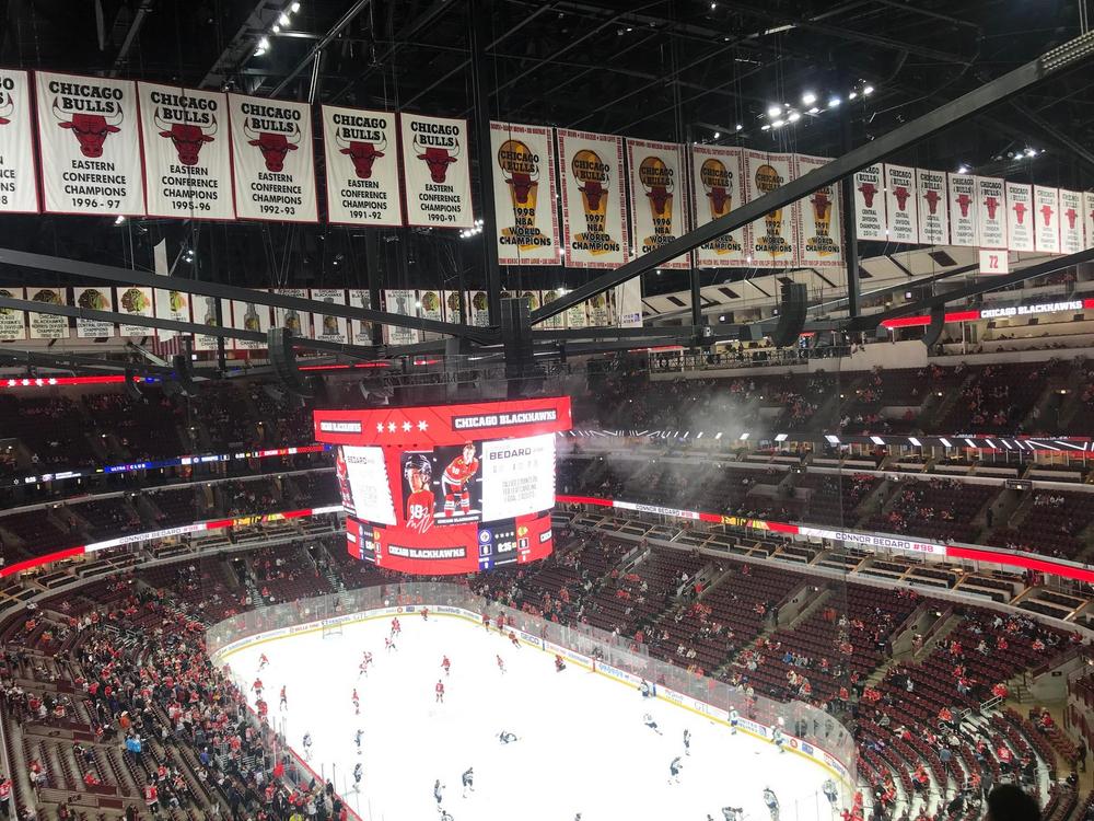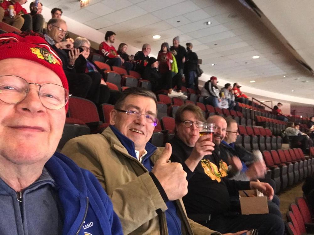 Heti 23 tunnin matkustamisen jälkeen olimme O'Haran lentokentällä, josta vielä junalla sinisellä linjalla majoitukseen Chicagon keskustaan. Olimme ennakkoon varanneet NHL-otteluun Chicago Blackhawks - Detroit Red Wings liput. Lopputulos oli 4–2 Blackhawksin hyväksi. Ottelu oli täynnä jännitystä ja hienoja suorituksia jäällä! Menimme hyvissä ajoin otteluun ja ennen aloitusta kävin pikkusuolaista ostamaan. Hotdogia ostamaan mennessä piti luottokorttia luettaa sisään mennessä. Sitten olutta ottamaan hyllystä. Vaan eipä se niin vain käynytkään, että heti ottaa. Piti passia näyttää! Sen jälkeen olut ja hotdogi matkaan ja ulos? Jollakin älyohjelmalla tiesi maksun periä. Perikin ihan oikein.