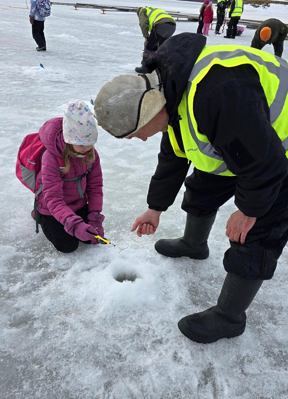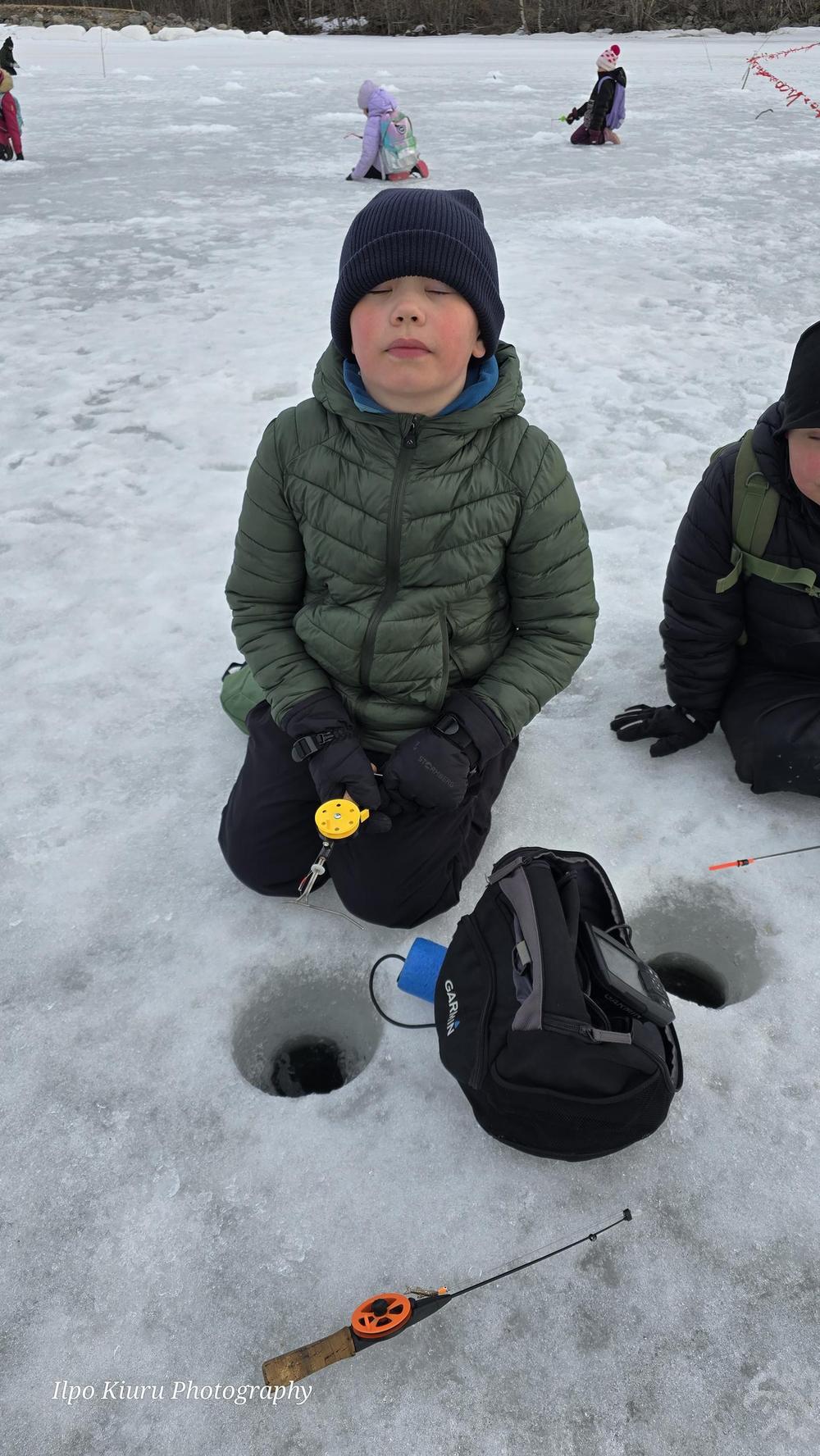 "Olemmie kerran melkein saanut kalan", Okko Silvola (8v) kertoo nykiessään pilkkiä hiljalleen LC Keminmaan järjestämässä lasten kalastustapahtumassa Keminmaan Valmariniemessä.