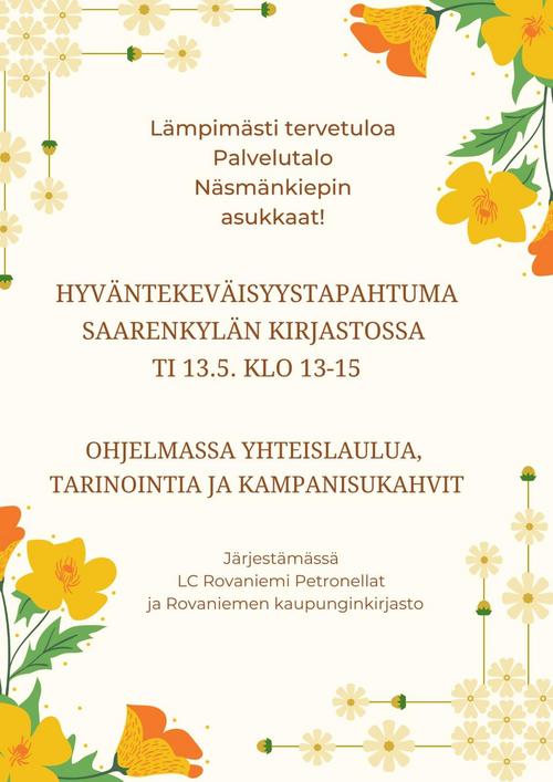 LC Rovaniemi Petronellat käyttivät ti 13.5. Näsmänkiepin palvelutalon asukkaita yhdessä hoitajien kanssa Saarenkylän kirjastossa Rovaniemellä. Kirjastossa tarinoitiin, laulettiin kanteleryhmän säestämänä ja juotiin kahvia kampanisujen keralla.