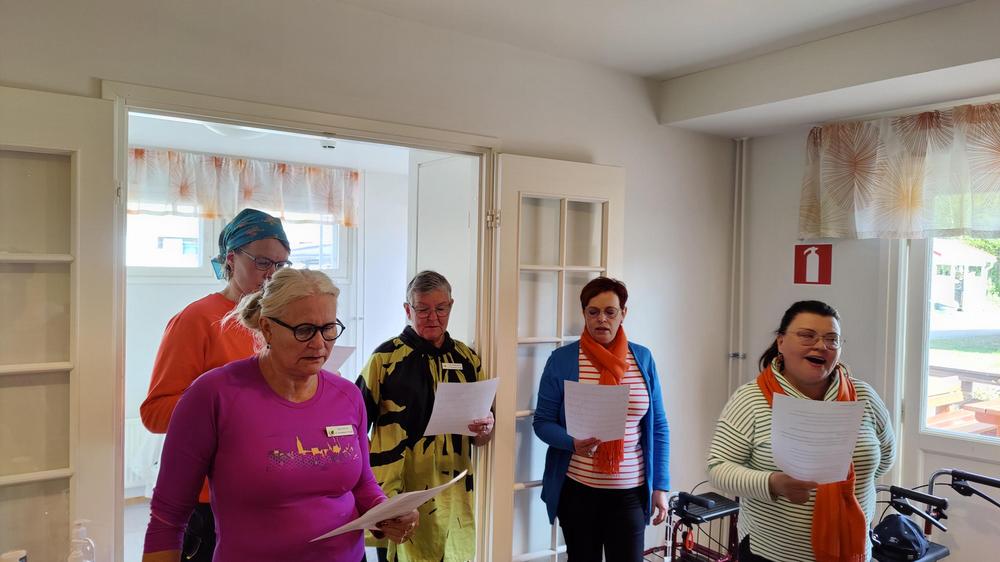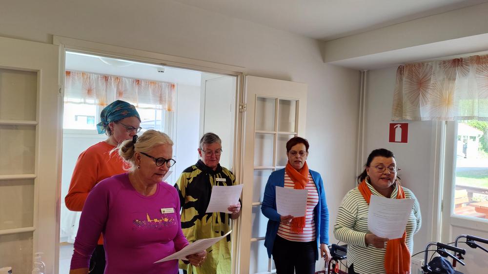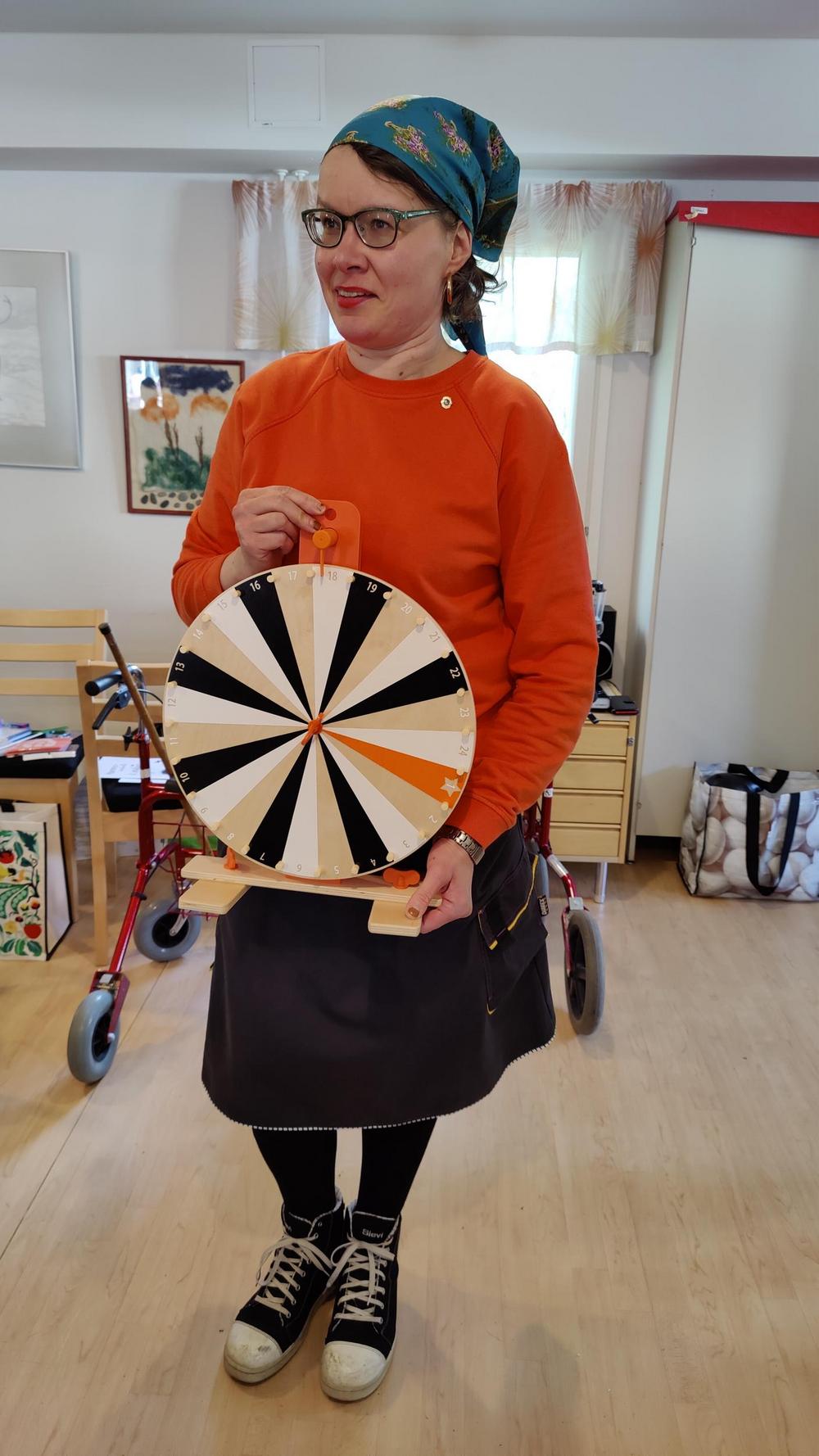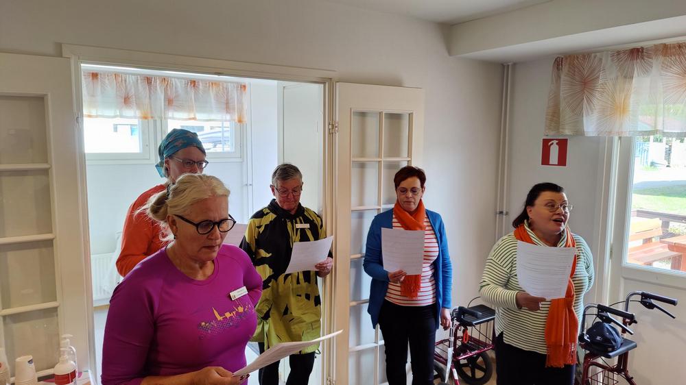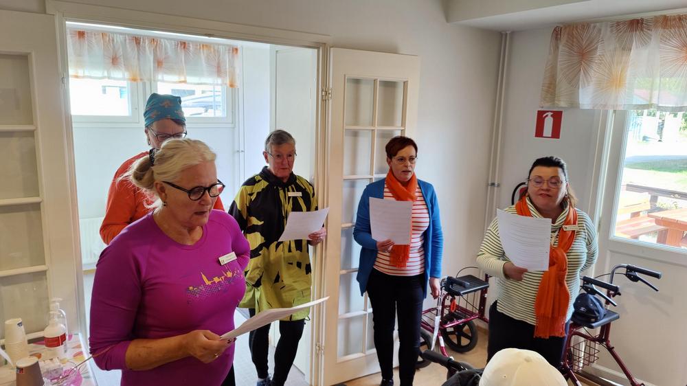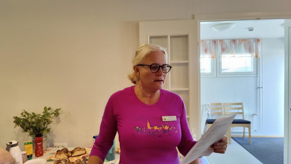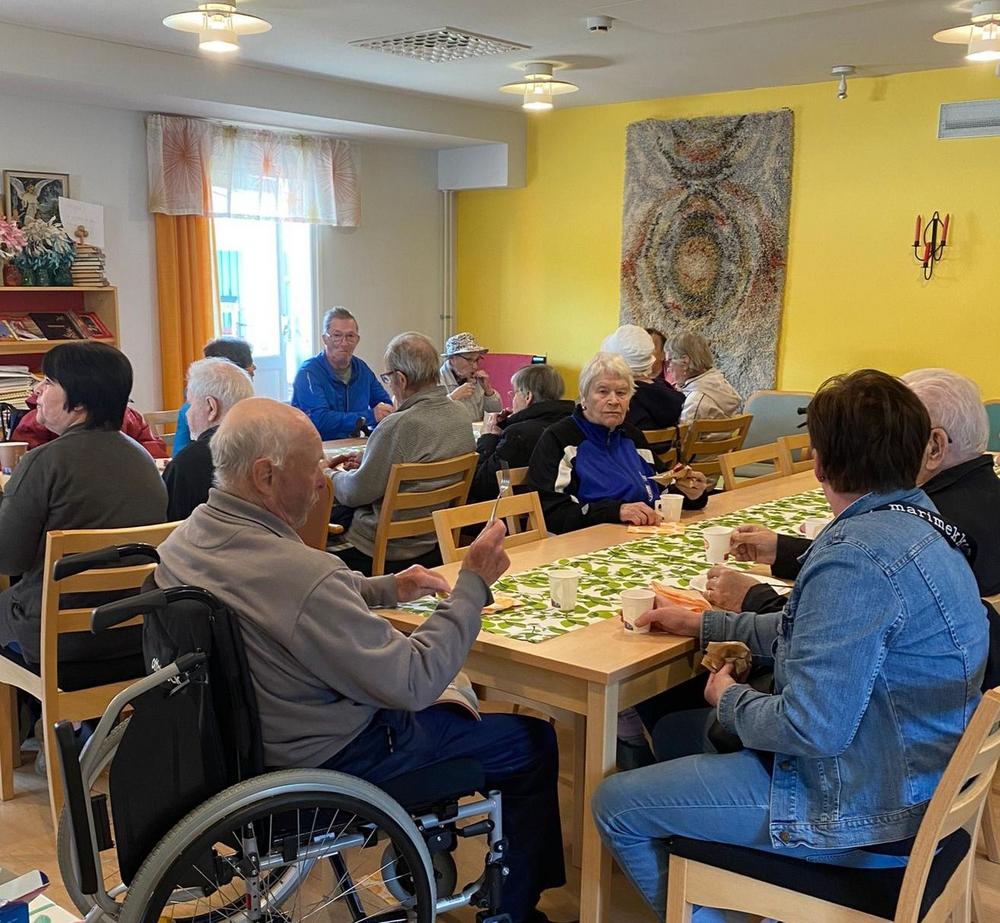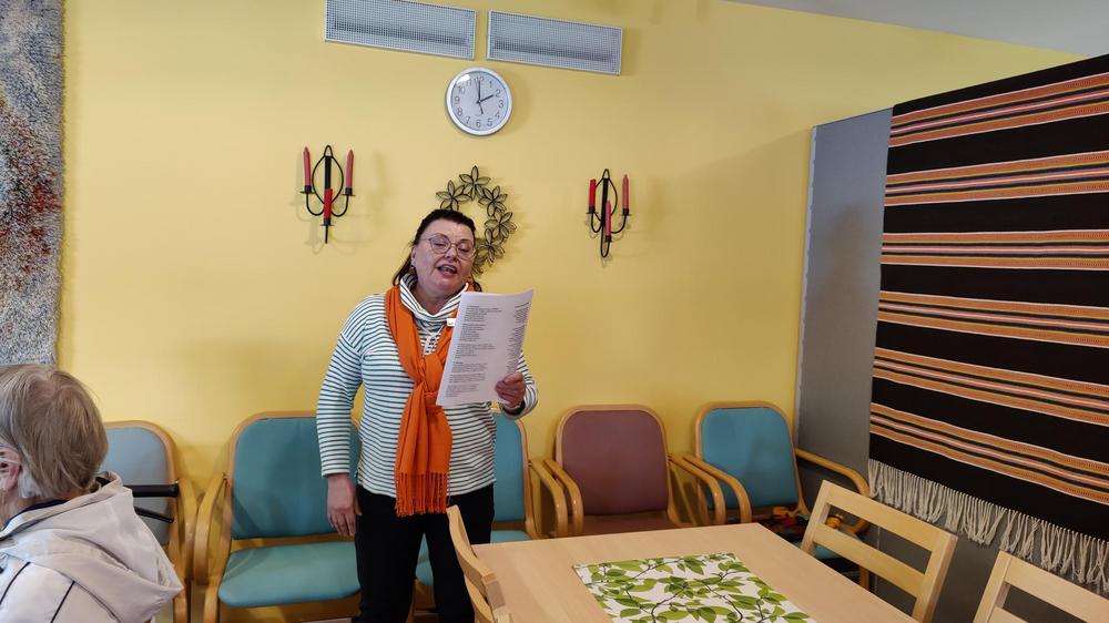 Aluksi maisteltiin makkaraa ja jälkiruuaksi nautittiin kahvia ja pullaa. Ohjelmassa oli mm. yhteislaulua ja Onnenpyörän pyöritystä yllätyspalkintoineen.