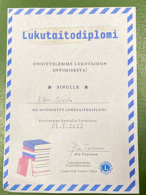 Klubimme on lahjoittanut kaikille Kivirannan koulun 67 ekaluokkalaisille oman kirjan. Ekaluokkalaisille järjestettiin lukutaitojuhla, jossa kaikille annettin diplomit ja kirjalahja, joilla kannustettiin lukemisen harrastusta myös kotona ja vapaa-ajalla. Lukujuhlassa oli mukana koulun entinen rehtori veli Ilpo Husa. Ilo ja riemu oli ylimmillään kun oppilaat saivat oman kirjan ja diplomin. Kuvassa Ilpo oppilaiden kanssa ja lukudiplomi.