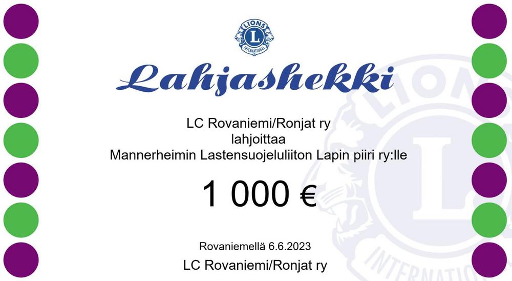 Ronjat kävivät tänään lahjoittamassa keväällä järjestämänsä Lastentapahtuman tuoton 1000 euroa MLL:n Lapin piirin lasten loma-aikojen kerhotoimintaan.