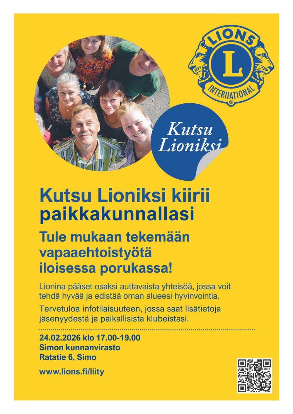 Lions-info 24.2.2026 klo 17.00-19.00 Simon kunnanvirastolla, Ratatie 6, Simo.