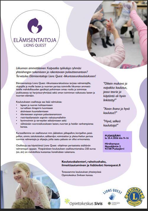 Elämisentaitoja Lions Quest- liikuntaseurakoulutus järjestetään Pudasjärvellä lauantaina 25.4.2026 klo 9-16 Hirsikampus, Nyynäjäntie 5, 93100 Pudasjärvi