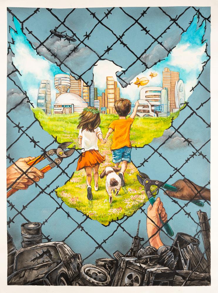 Kuvassa kiinalaisen 13-vuotiaan Shuwen Wangin työ, joka voitti kansainvälisen rauhanjulistekilpailun pääpalkinnon kaudella 2024-2025.