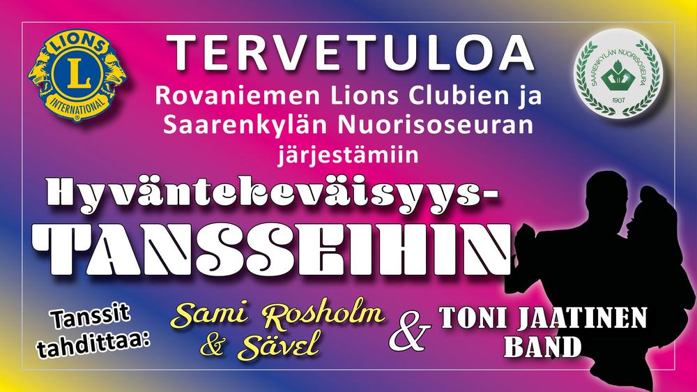 “Tänään Tanssitaan Hyvän tähden!” Rovaniemen Lions Clubit ja Saarenkylän Nuorisoseura ry kutsuvat Sinut mukaan! Tänään la 18.10. vietämme kivaa iltaa ja tanssimme Hyväntekeväisyystansseissa klo 19-24…
