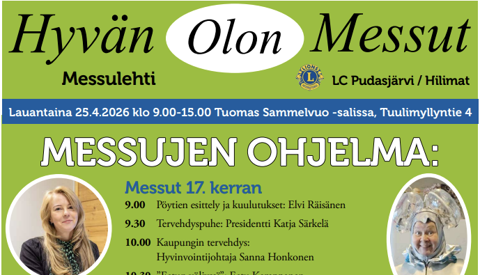 Lions Club Pudasjärvi/Hilimat toivottaa kaikki tervetulleiksi Hilimojen järjestämille Hyvän Olon Messuille – jo 17. kerran! Hyvän Olon Messut la 25.4.2026 klo 9.00-15.00 Tuomas Sammelvuo -salissa, Tuulimyllyntie 4. Lue oheinen Hilimojen Messulehti.