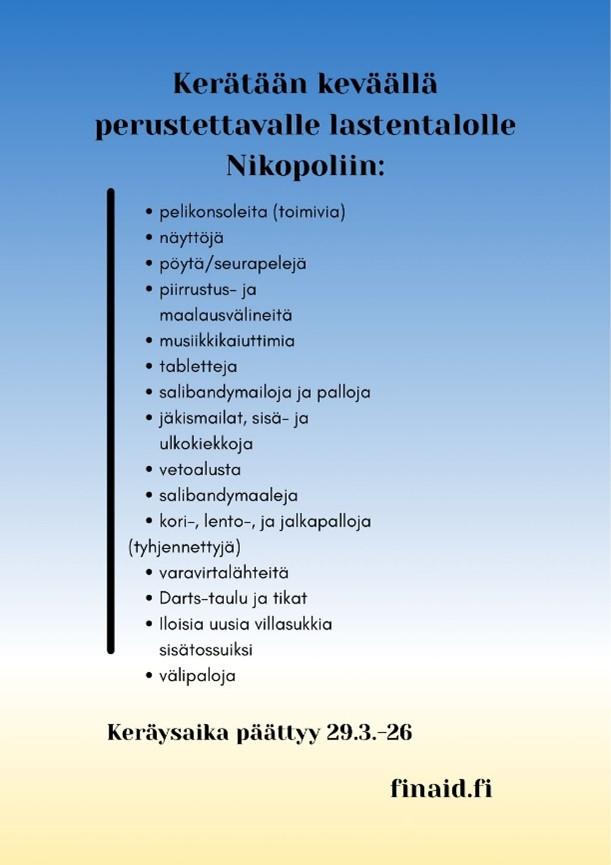 Nikopoliin perustetaan lastentalo, jonka varusteiden hankintaan klubit voivat osallistua. Sopivia tarvikkeita voi löytyä klubilaisilta kotoakin. Tärkeää on varmistaa, että lahjoitettavat tarvikkeet ovat ehjiä ja toimivia. Keräysaika on maaliskuu.