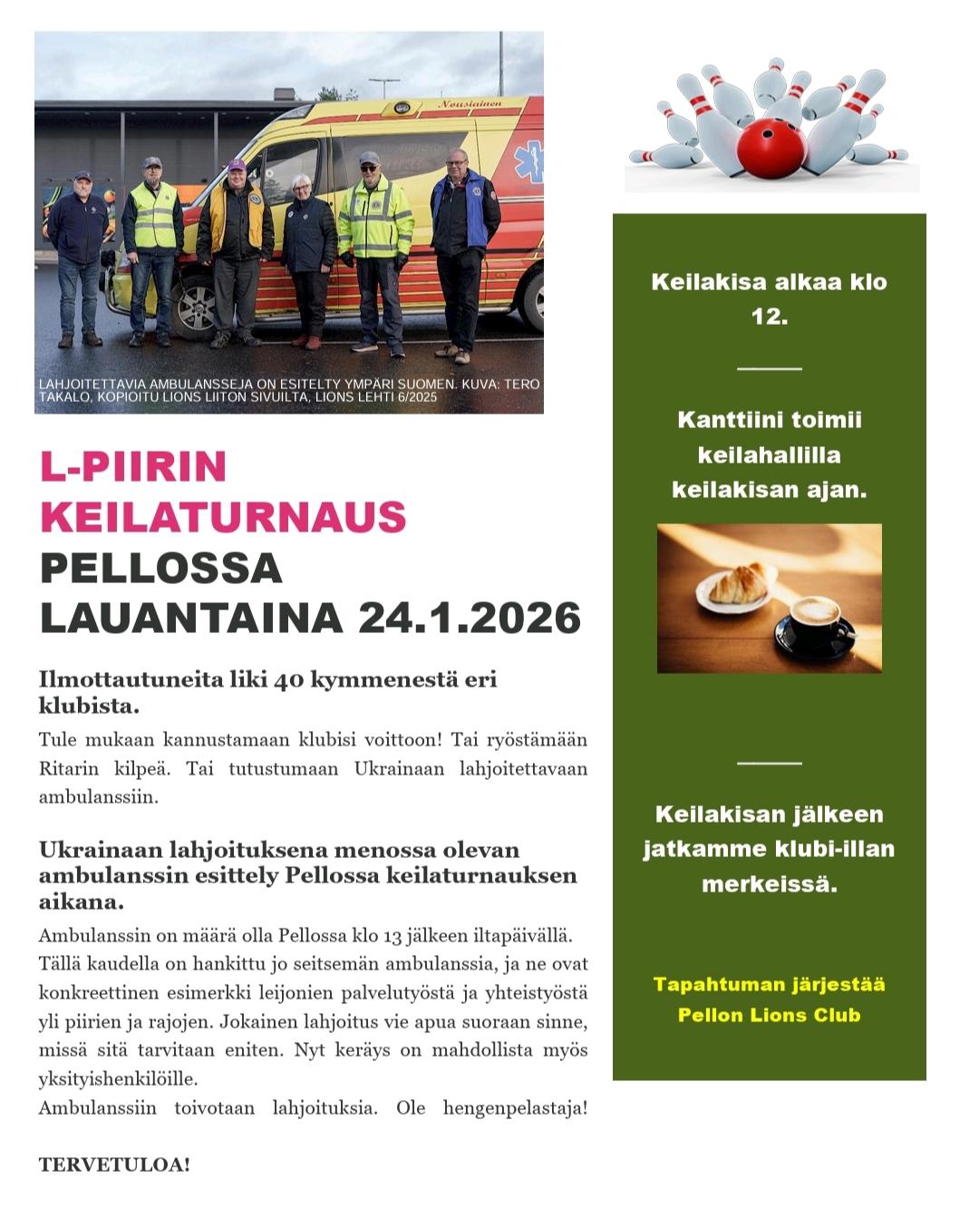 Ambulanssin on määrä olla Pellossa klo 13 jälkeen iltapäivällä. Tällä kaudella on hankittu jo seitsemän ambulanssia, ja ne ovat konkreettinen esimerkki leijonien palvelutyöstä ja yhteistyöstä yli piirien ja rajojen. Jokainen lahjoitus vie apua suoraan sinne, missä sitä tarvitaan eniten. Nyt keräys on mahdollista myös yksityishenkilöille.