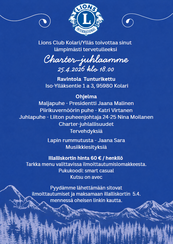 Tervetuloa L-piirin nuorimman klubin LC Kolari/Ylläksen Charter-juhlaan Ylläsjärvelle ravintola Tunturikettuun 25.4.2026 klo 18.00.