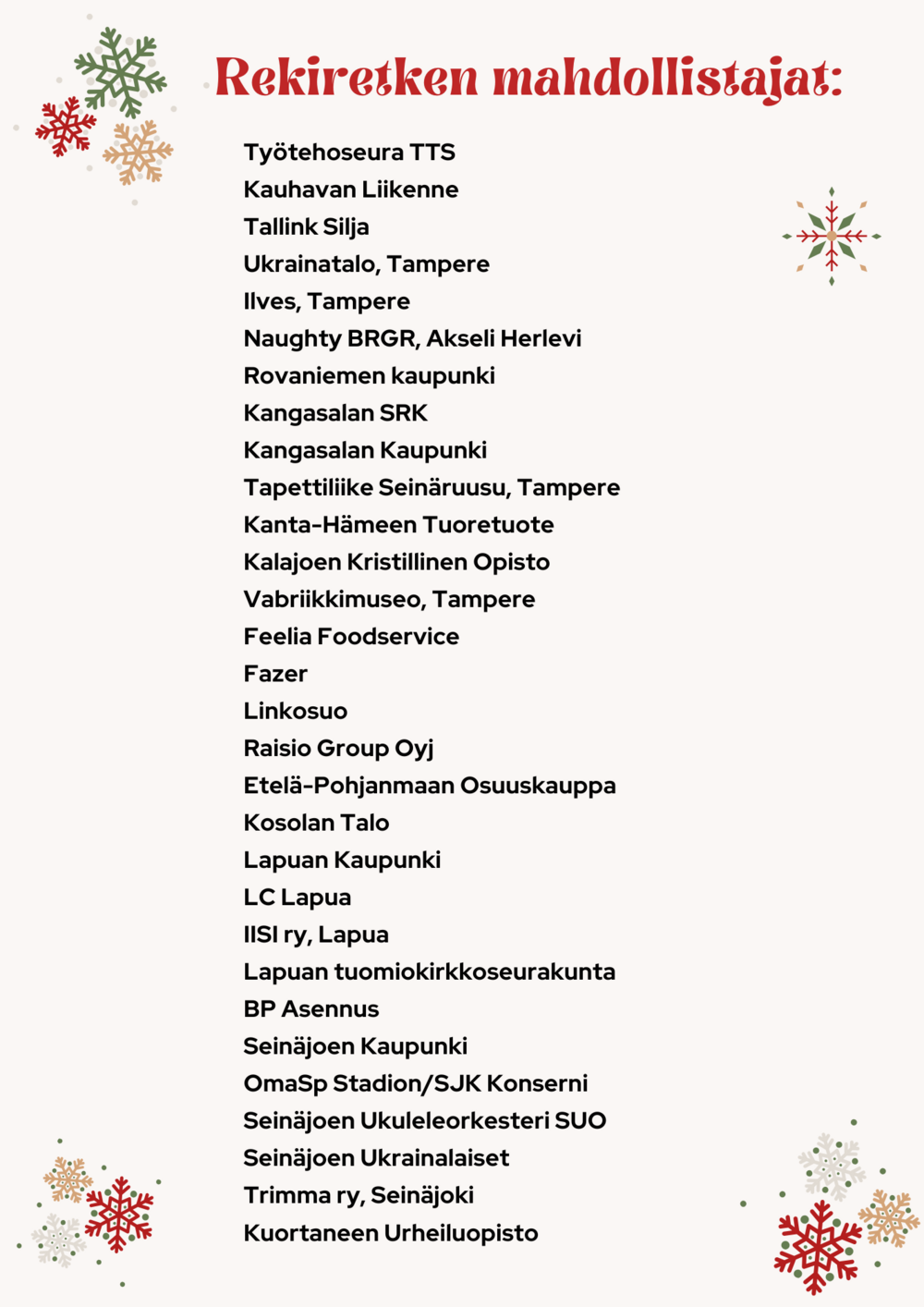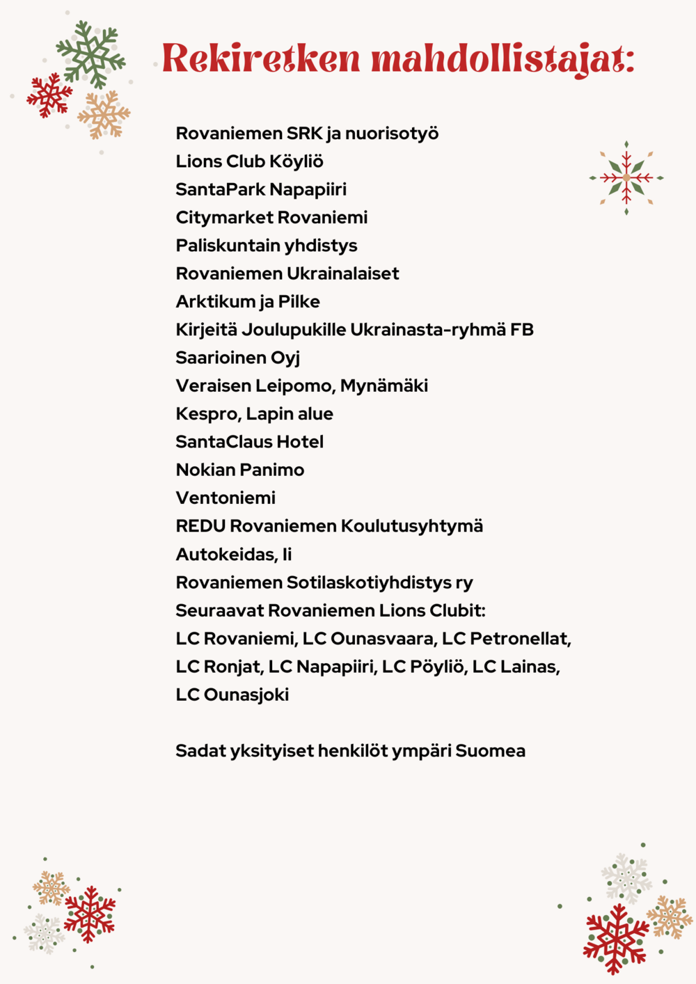 Mukaan saatiin ihan uskomaton määrä lahjoittajia, tällä hetkellä 59 kpl sekä yhteisöjä, yrityksiä että yksityisiä ihmisiä ympäri Suomea. Redulta saadaan 100 muikkusäilykepurkkia ukrainalaisille nuorille takaisinpaluulle kotiinvietäväksi. Lions Club Köyliö toimittaa retkeläisten joulupöytään lämminsavulohta ja muita ruokatarpeita on tullut paljon lisää eri lahjoittajilta, mm. Kesprolta. Rovaniemen kaupunki kustantaa linja-autojen polttoaineet Helsingistä Rovaniemelle ja takaisin. Paljon monenlaista lahjoitusta mahtuu tähän tapahtumaan!