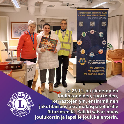 L-piirin LCIF-apurahatyöryhmän leijonien ja Ritarinteen porukan yhteinen ensimmäinen mikroaaltouunien, imureiden ym. pienkoneiden jakelu ukrainalaistalouksiin tehtiin torstaina 21.11. Lähdettiin Ritarinteeltä liikkeelle klo 18 tuotepakettien kanssa ja päästiin toivottamaan Hyvää Joulua yhdeksälle perheelle eri puolille Rovaniemen kaupunkia.