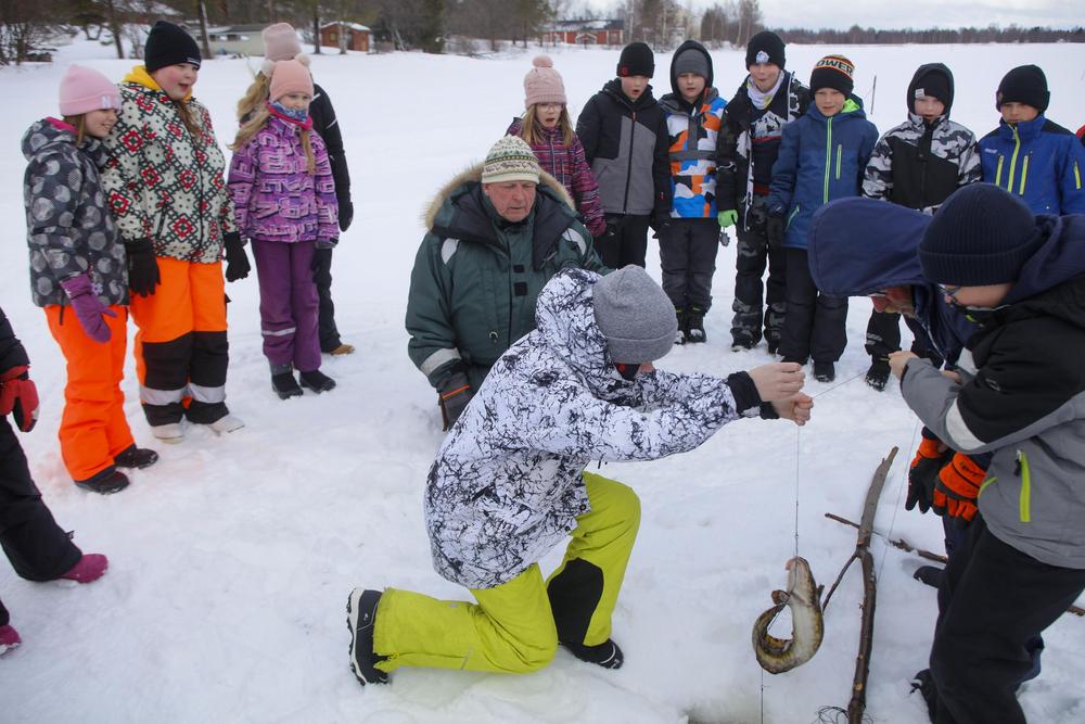 – Olen käynyt aiemminkin pilkillä. Isä opetti, että mitä lähempää pohjaa pilkkii, sitä paremmin saa kalaa. Tämä on ollut mukava koulupäivä, Jussi kertoi.