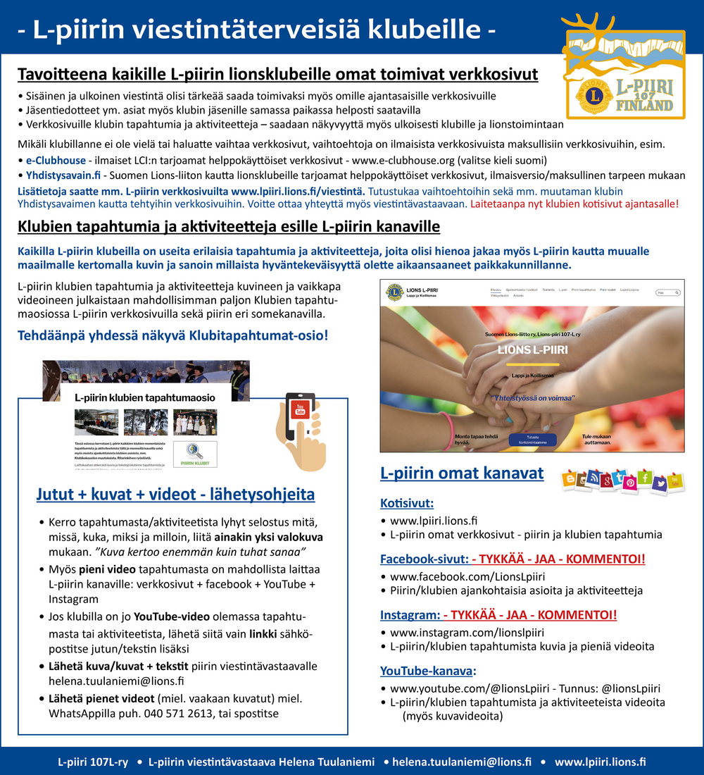 - Verkkosivuille klubin tapahtumia ja aktiviteetteja – saadaan näkyvyyttä myös ulkoisesti klubille ja lionstoimintaan